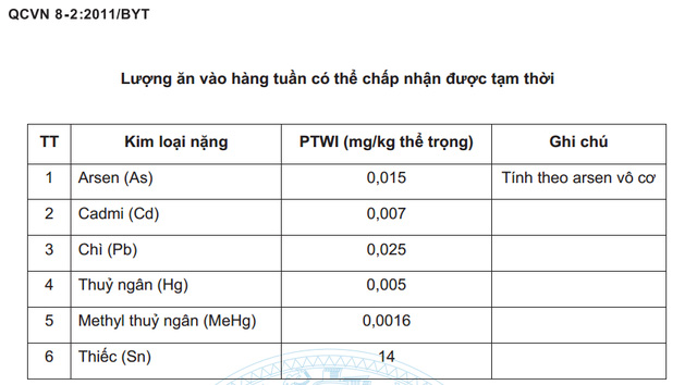 QCVN 8-2:2011/BYT dài 13 trang, quy định quy chuẩn quốc gia đối với giới hạn ô nhiễm kim loại nặng trong thực phẩm. Trong quy chuẩn này, 6 loại kim loại nặng được đưa ra giới hạn an toàn gồm: Arsen (Thạch tín), Cadmi, Chì, Thủy ngân, Methyl thủy ngân, và Thiếc.